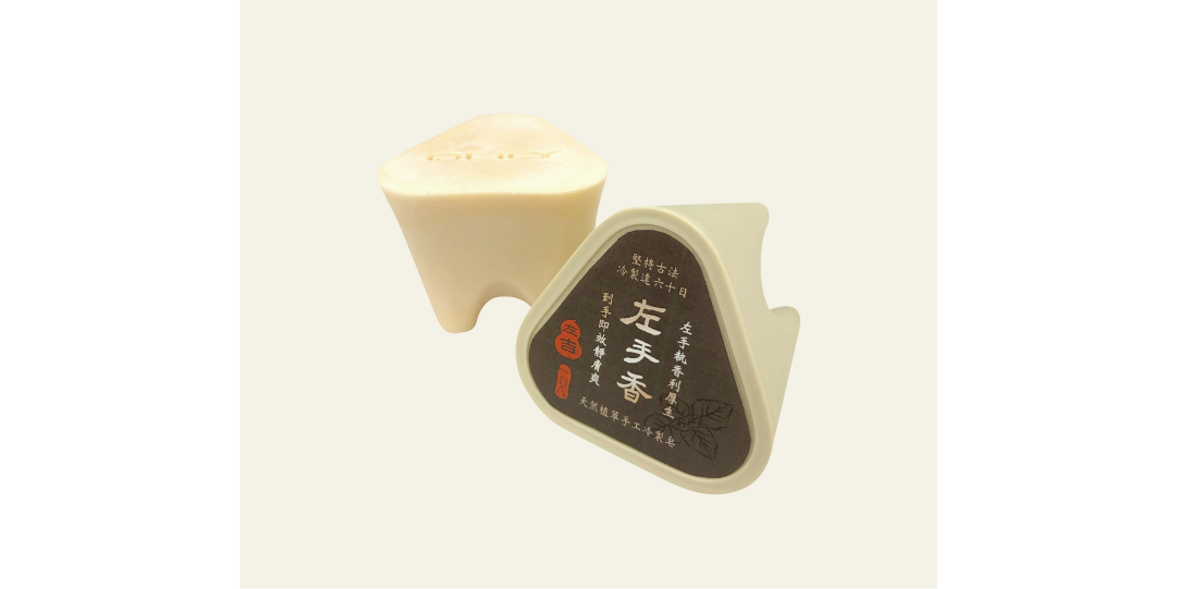 〈天然植萃左手香皂〉原料萃取自左手香、蘆薈與廣藿香精油,獨特的草本薰香搭配具有鎮定效果的蘆薈,使人神清氣爽、聚財得福。