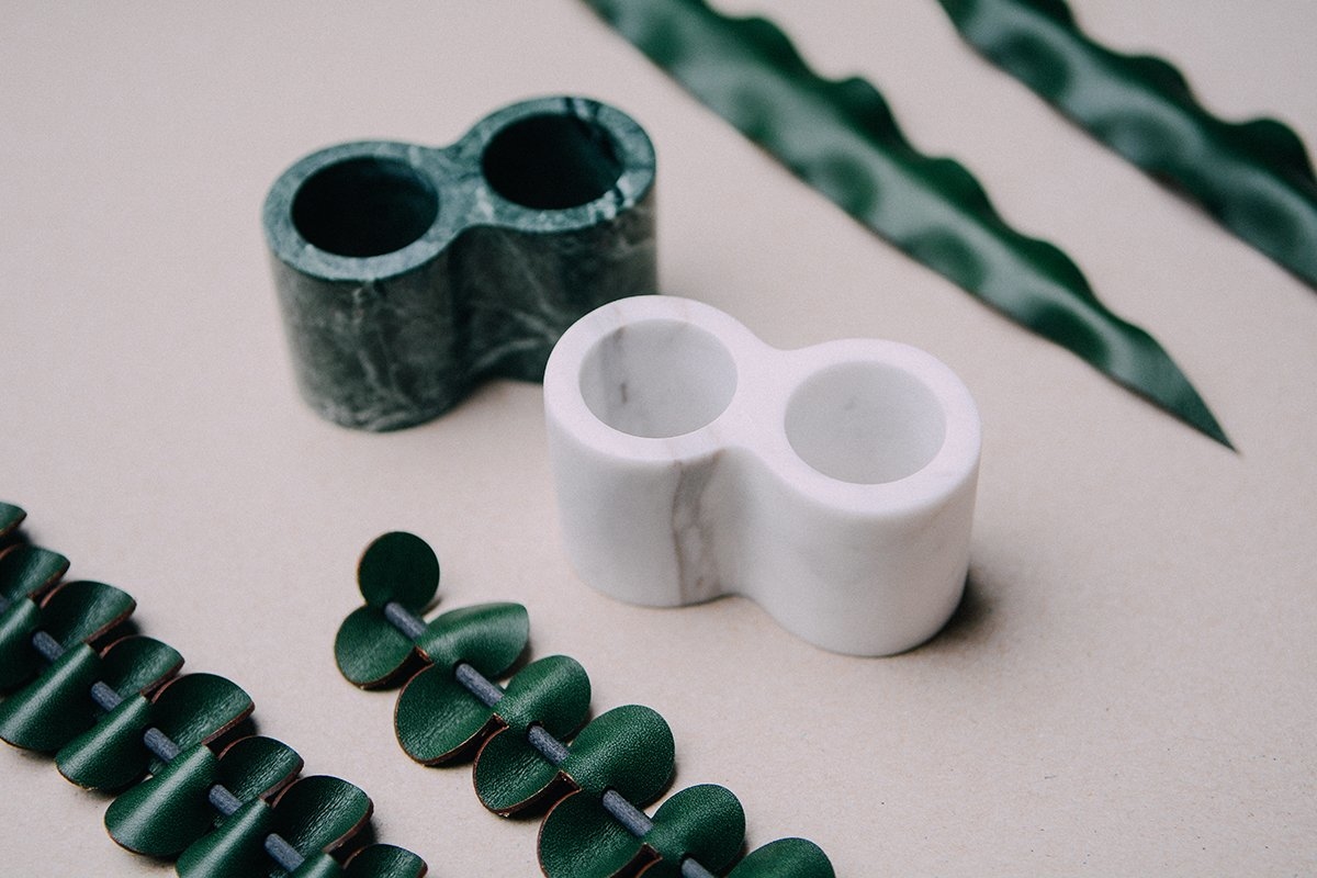 依循植物生長脈絡,歸整百種植物葉片的輪廓外型與質感特性,以皮塑工藝重新詮釋植物的姿態風貌。葉葉YEYE簡約植物的造型線條,使用特殊皮塑技術臨摹自然姿態,藉此保存葉片本身的個性與材料質地:不論是山蘇的浪狀葉緣或蕨類的繁複羽葉,都能以革植物的型態一一呈現。