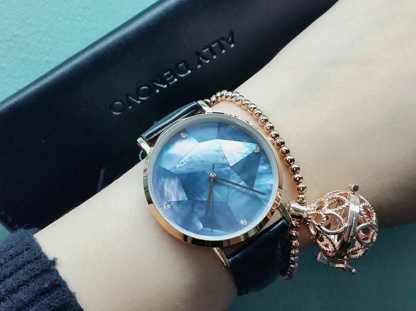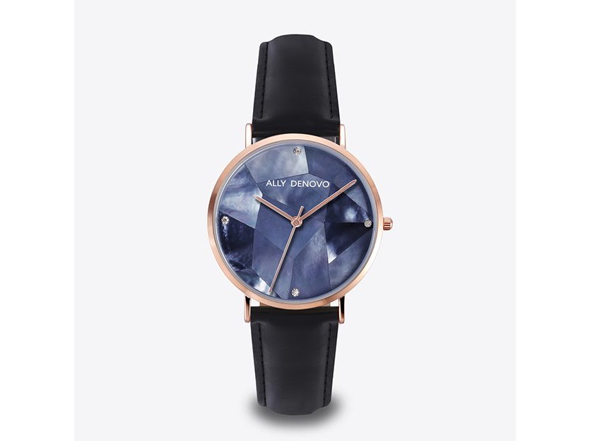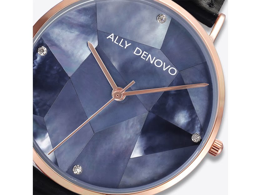 ALLY DENOVO Gaia Pearl皮革腕錶-藍色菱形琉璃玫瑰金框黑色真皮錶帶
