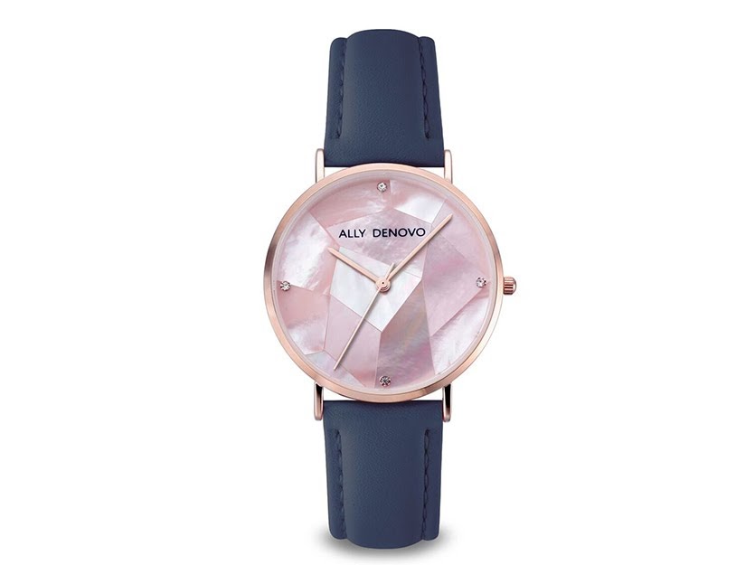 ALLY DENOVO Gaia Pearl皮革腕錶-粉色菱形琉璃玫瑰金框海軍藍真皮錶帶