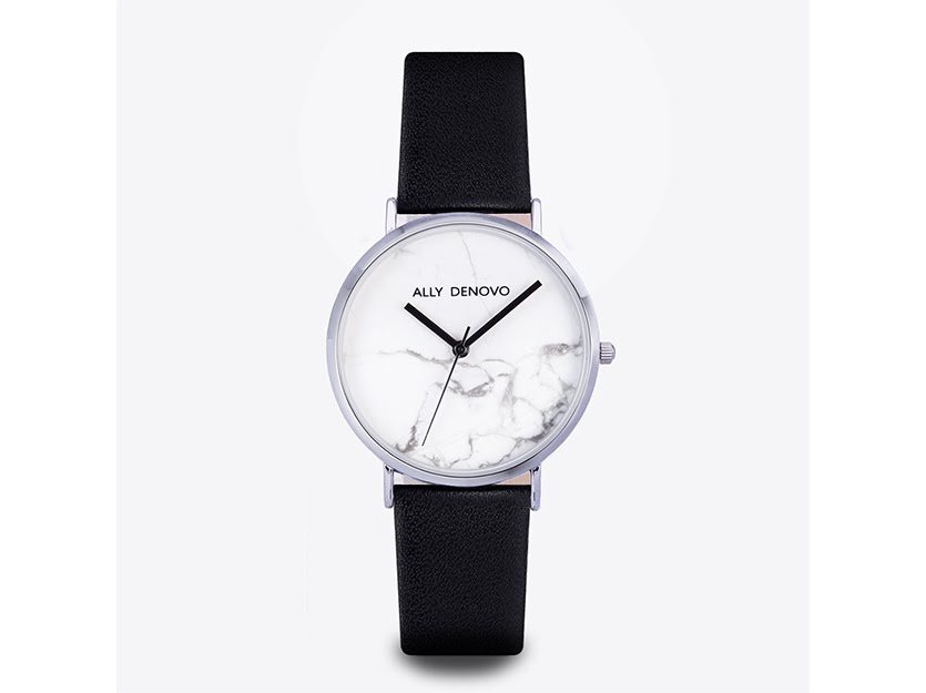 ALLY DENOVO Carrara Marble皮革腕錶-白大理石銀框黑色真皮錶帶
