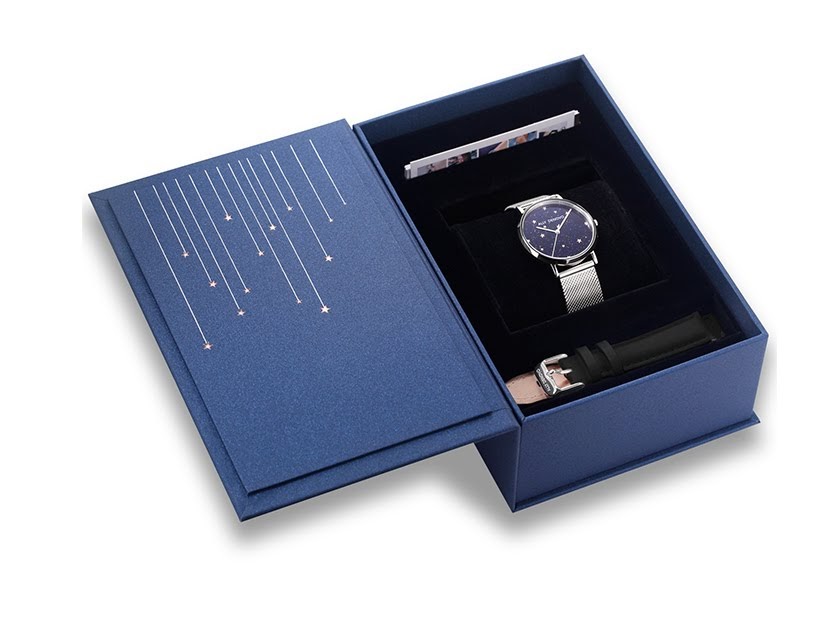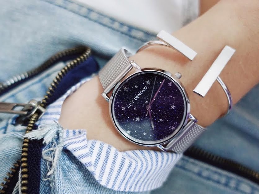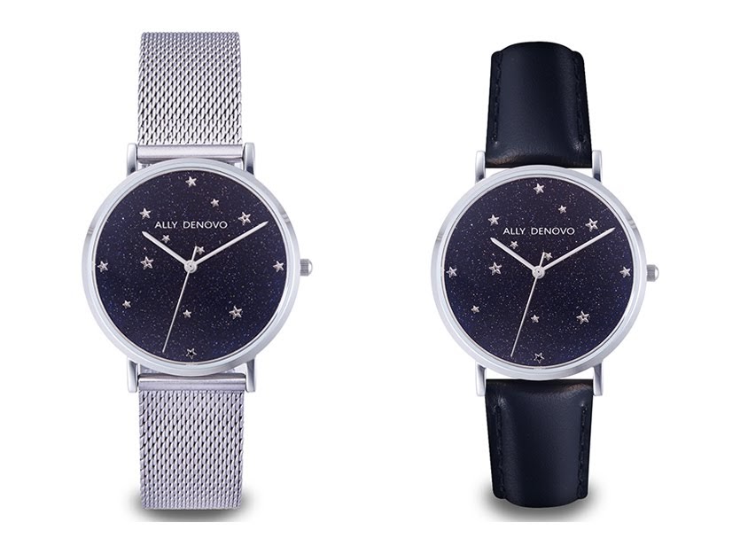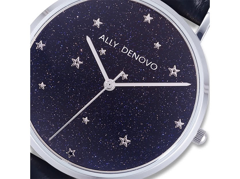 ALLY DENOVO Starry Night系列,錶面材質取自接近全黑的深藍色天然礦石,每一個角度都微微發光展現不同的星夜景象。此款搭配銀色鍊帶,以及另一組黑色真皮錶帶,可自行替換。交換搭配都呈現出華麗又帶有點神祕的迷人風格。
