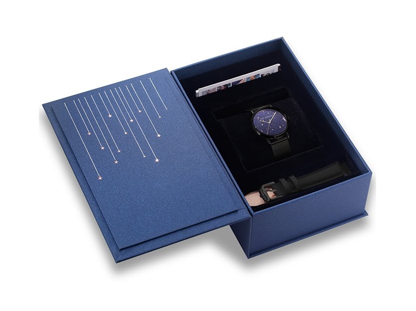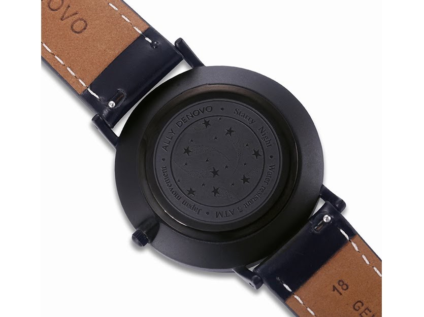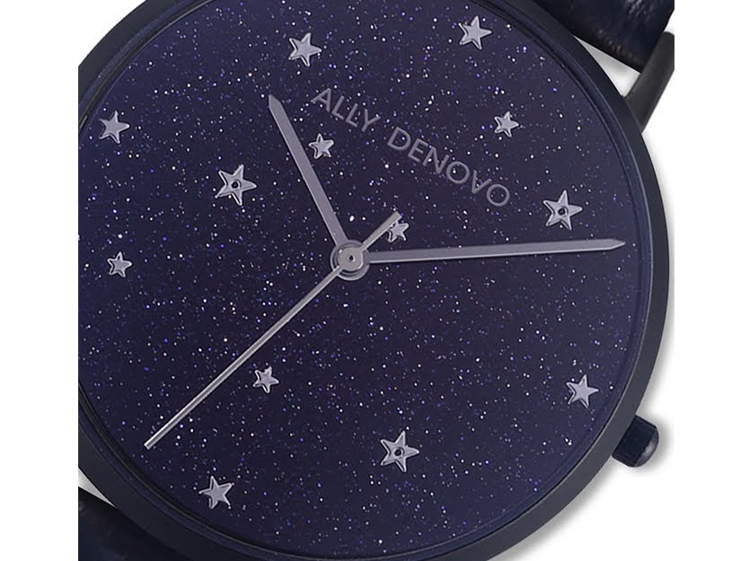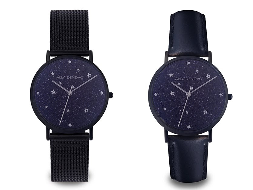 ALLY DENOVO Starry Night系列,錶面材質取自接近全黑的深藍色天然礦石,每一個角度都微微發光展現不同的星夜景象。此款搭配黑色鍊帶,以及另一組黑色真皮錶帶,可自行替換。交換搭配都呈現出華麗又帶有點神祕的迷人風格。