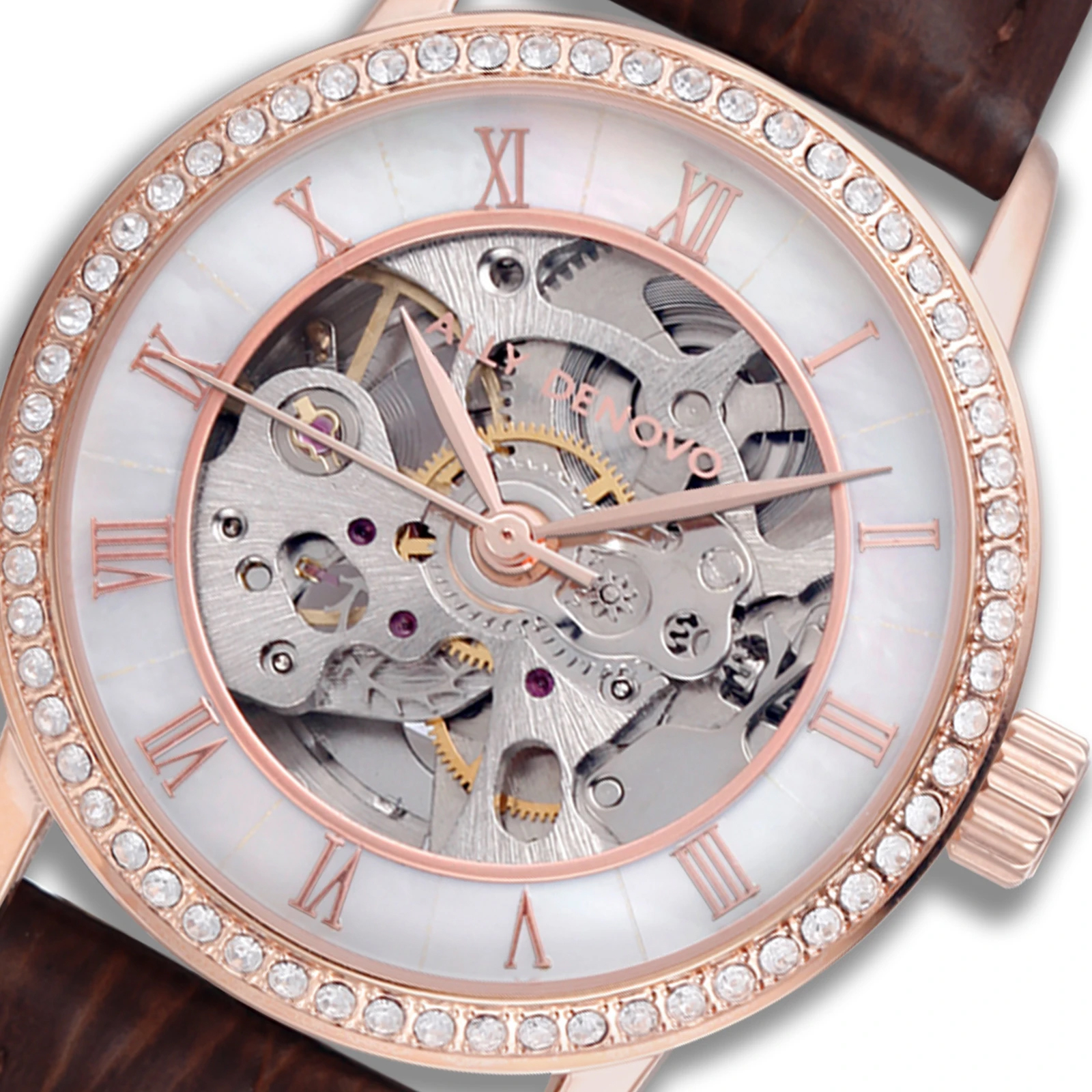 ALLY DENOVO 珍珠機械鑽錶 - 玫瑰金系列(白珍珠)搭配咖啡色真皮鱷魚紋錶帶