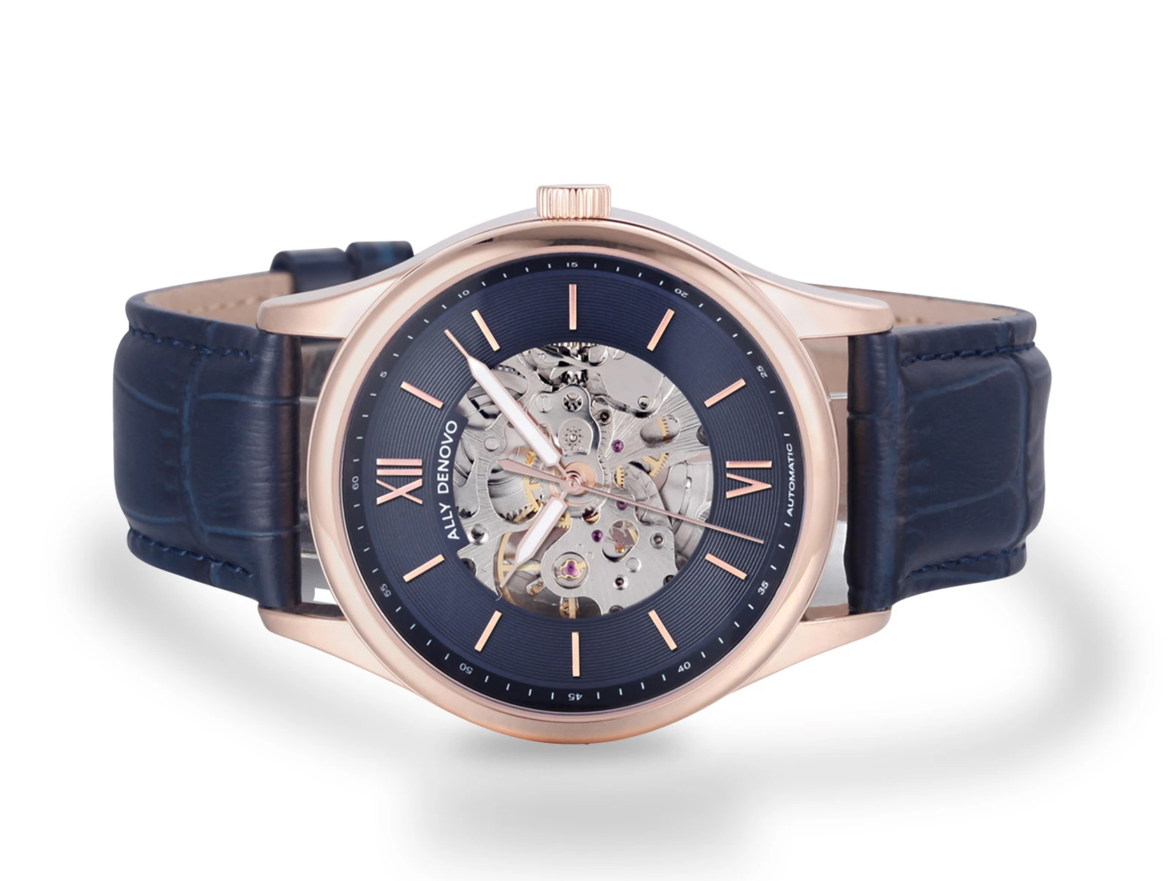 ALLY DENOVO 珍珠機械鑽錶 玫瑰金系列-(海軍藍)搭配海軍藍真皮鱷魚紋錶帶