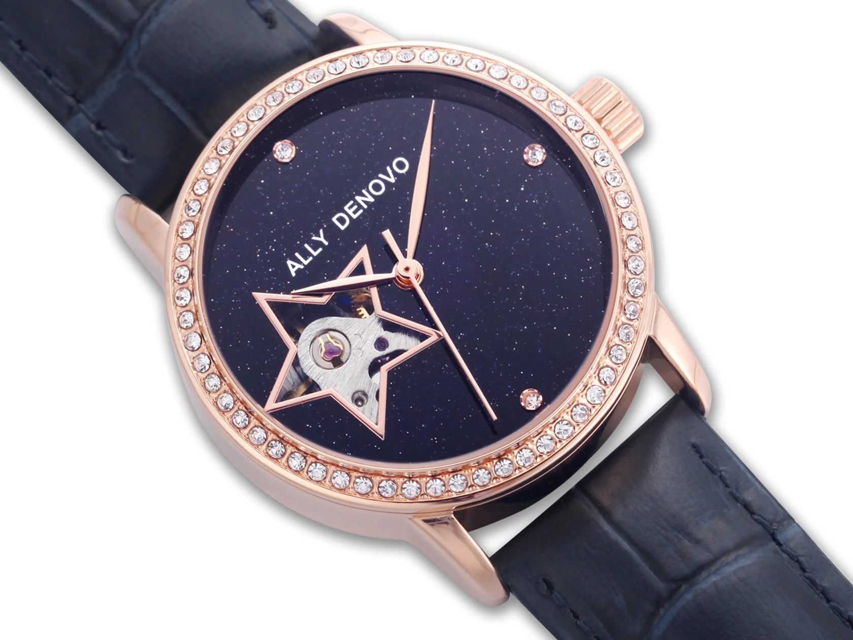 ALLY DENOVO 玫瑰金星夜機械鑽表禮盒(雙錶帶:海軍藍真皮鱷魚紋錶帶/玫瑰金錬帶)