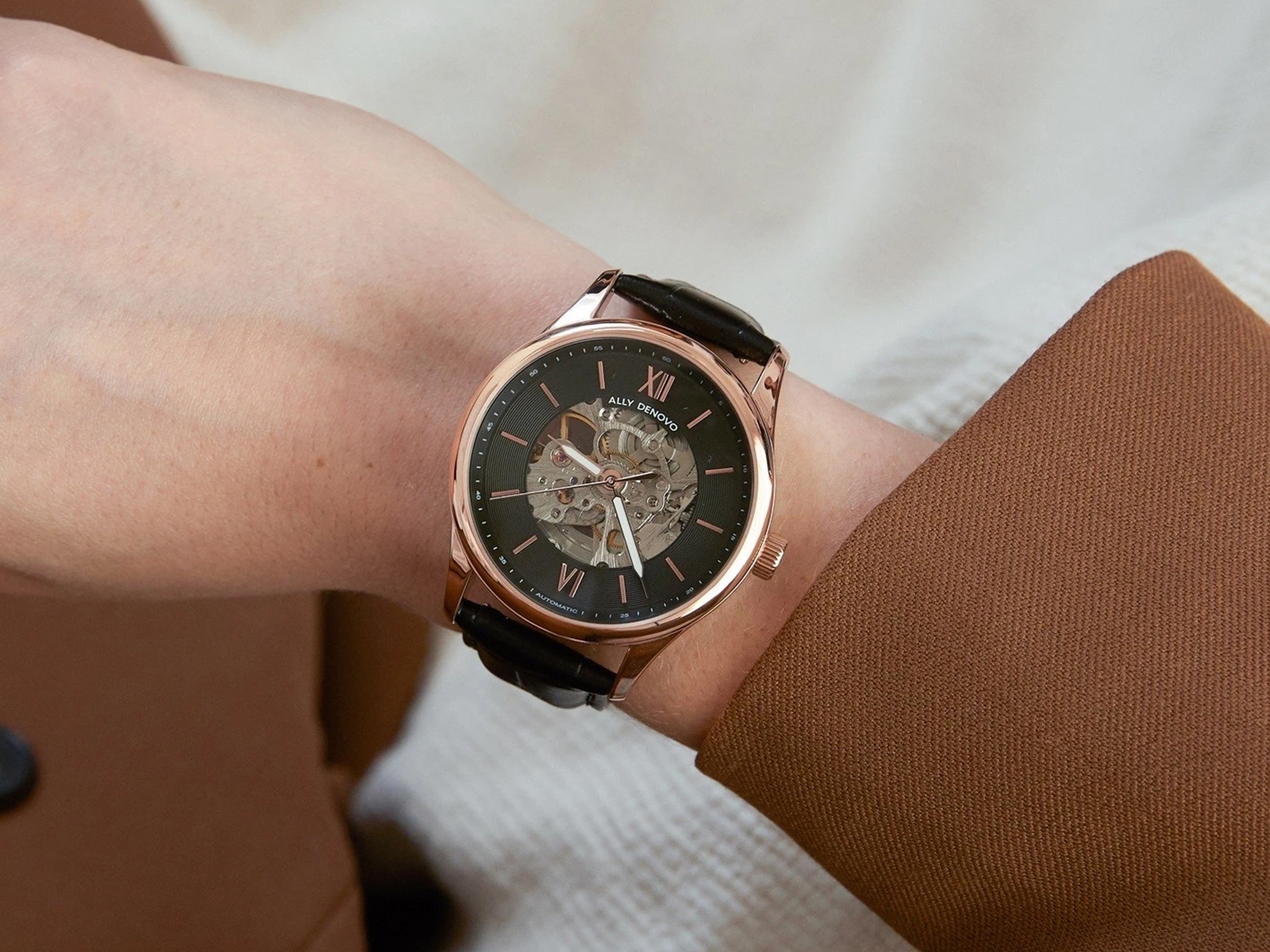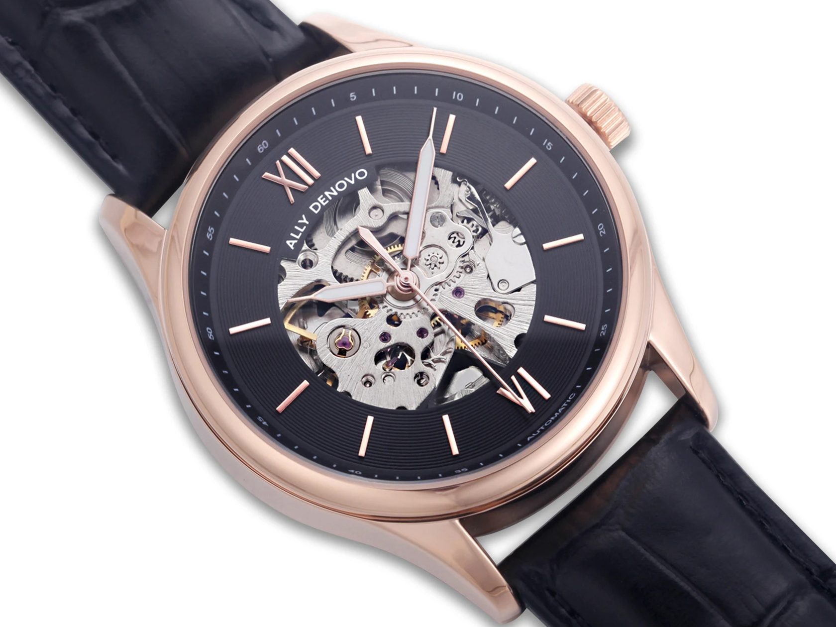 ALLY DENOVO 古典機械錶 - 玫瑰金系列 搭配黑色真皮鱷魚紋錶帶
