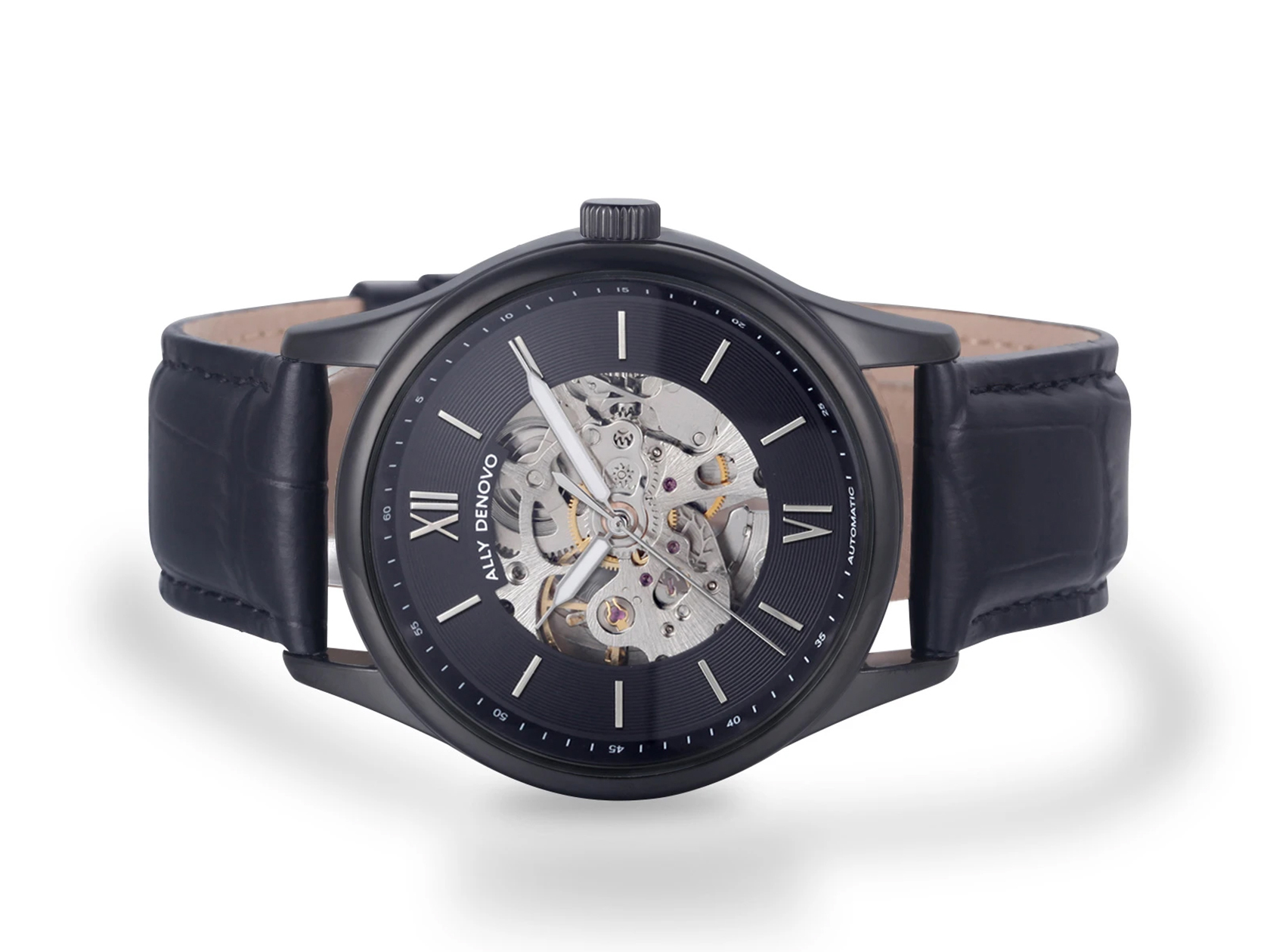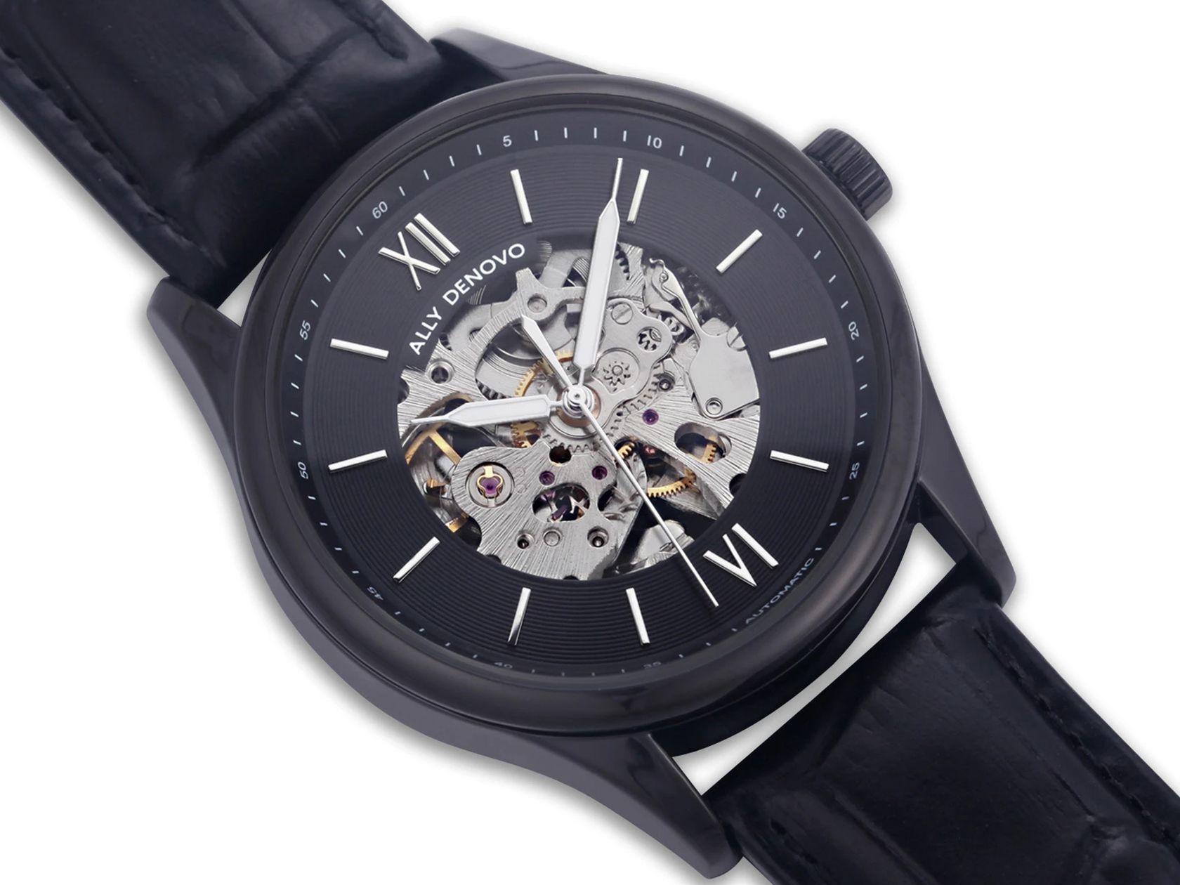 ALLY DENOVO 曜石黑 古典機械錶 - 黑色真皮鱷魚紋錶帶