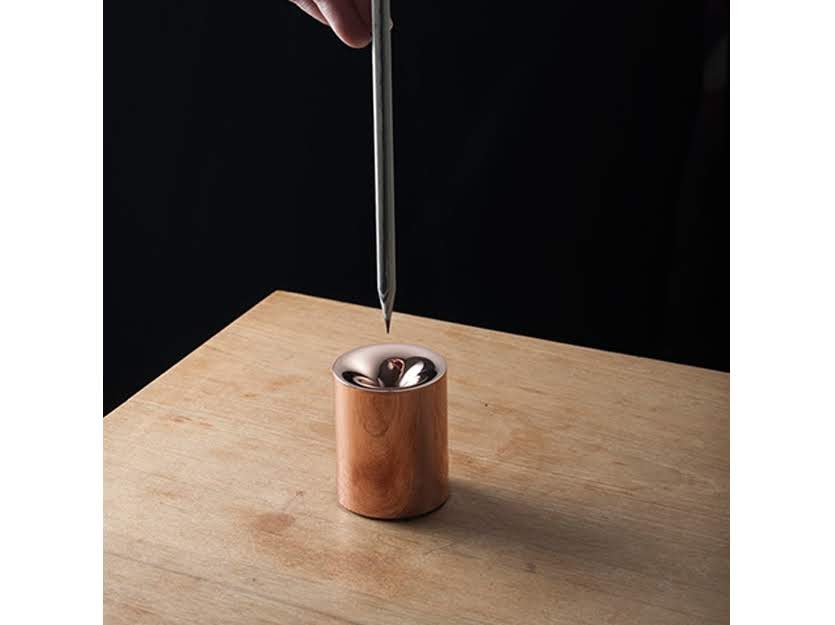彷若隨重力場陷下的內凹曲面不但捕捉了觀者的目光,更讓人忍不住想將一枝枝鉛筆放入那個神祕的空洞。手工打磨而成的美麗外表,讓它成為十分稱職的紙鎮與案頭的微型雕塑。