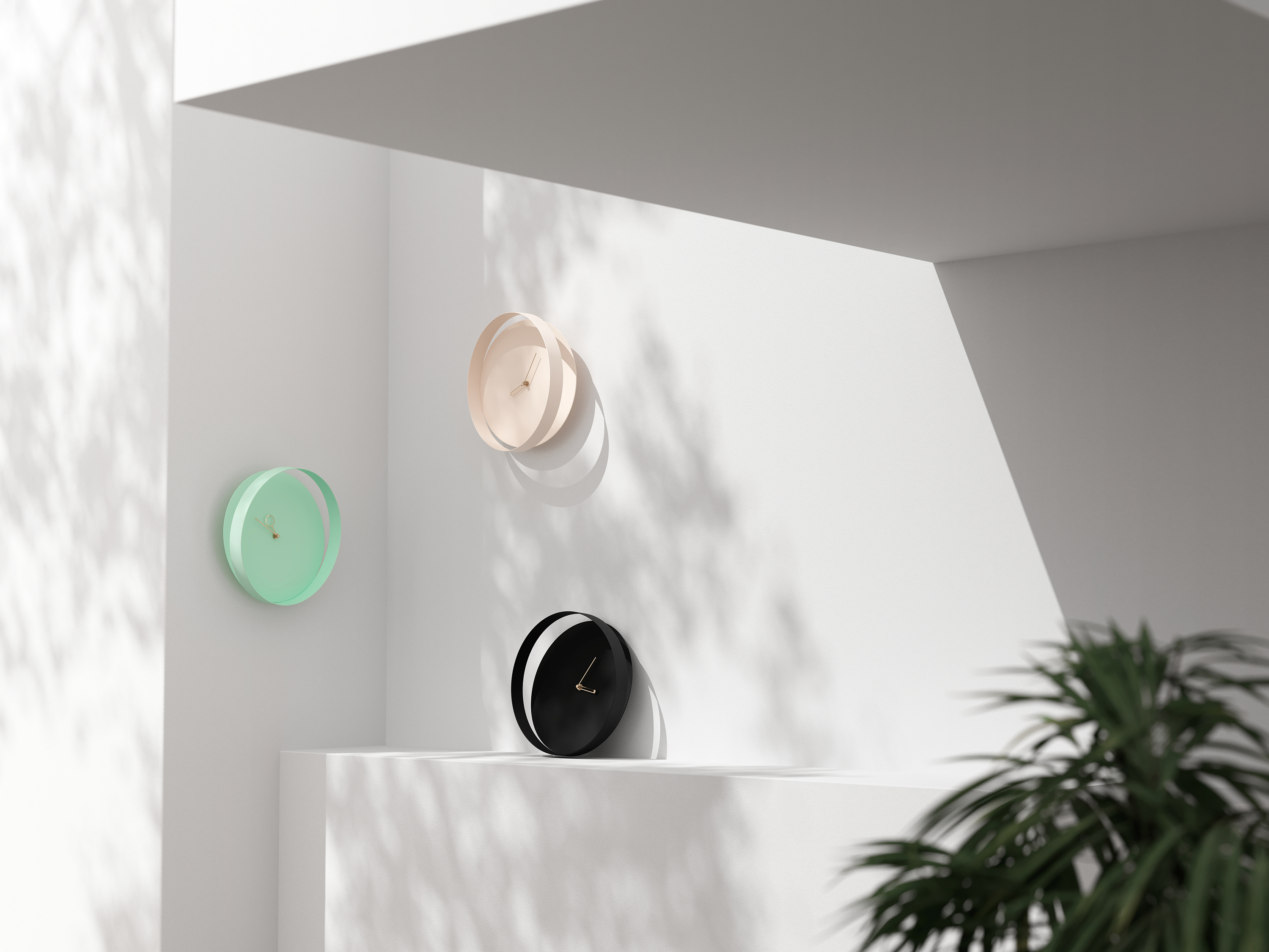 Orbis時鐘設計靈感源自時鐘可以自然的融入室內空間的邊角、樑柱或是層版台架,讓時鐘的定位不再只是牆面上的一個二維視覺,而是隨著空間和光影節奏呈現出截然不同的面貌。