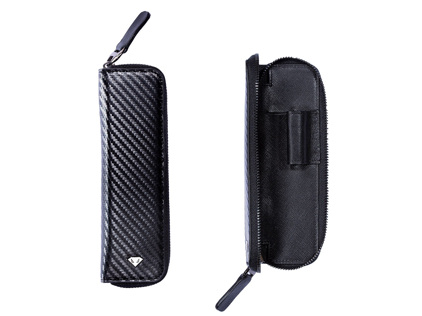 經典碳纖維紋路搭配嚴選牛皮材質,內裡暗藏獨家X技術編織而成的碳纖布。共2個筆槽。