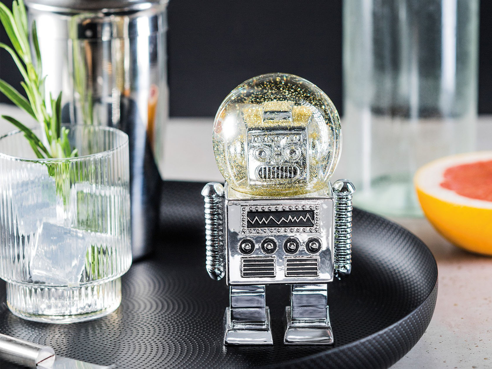 -精緻的金色閃光片在復古機器人充滿水的頭盔裡,只需搖晃,效果極佳