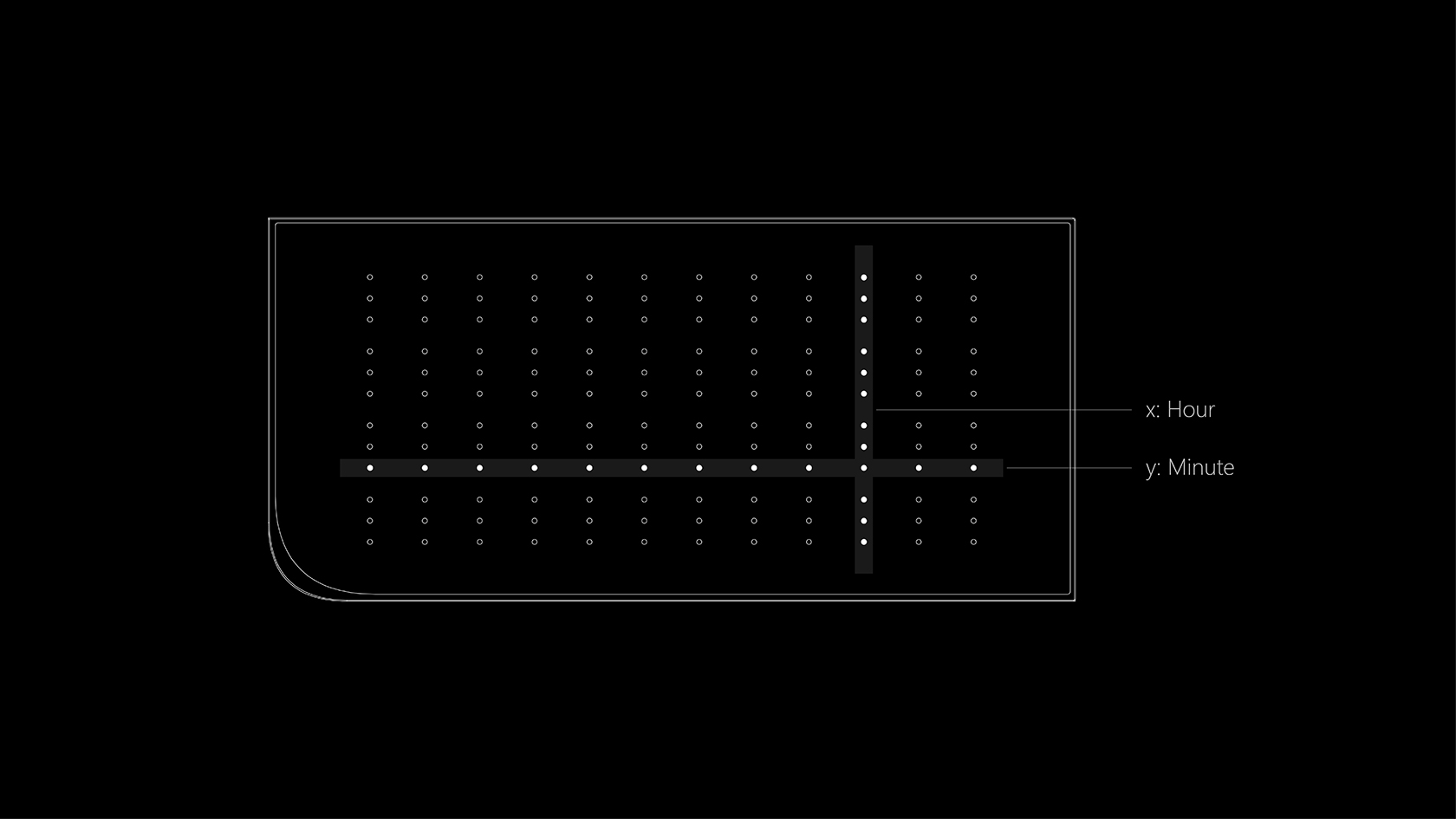 在「象限」上能看到如同x,y軸的燈光列,x為時,y為分,橫向12顆燈列各為每一小時;縱軸為12顆小燈球,每一點是5分鐘,並有三顆為一組的非等距排列,作為辨識時間的直觀設計。