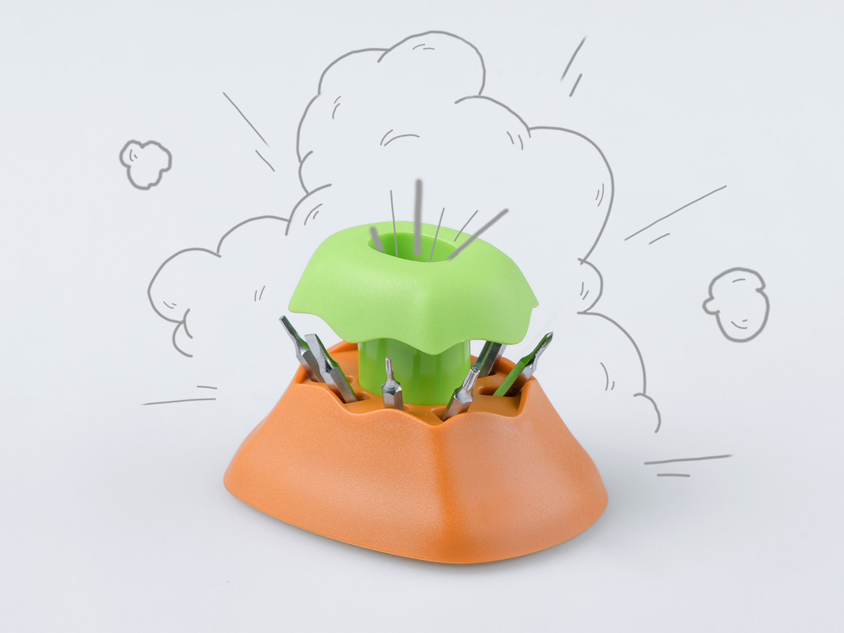 珊珊以環保且具高韌性工程級PP塑膠製成,曼曼的身體則以PP塑膠為基材,表面包覆TPR環保橡膠,提高握持舒適感並同時強化施力所需之摩擦度。為確保日後正式生產時之質感與精緻度,特採用雙色射出、一體成型方式生產;起子中心座採用不銹鋼,Bits起子頭採用矽合金鋼(S2) ,表面鍍鉻防鏽處理,均為專業級工具首選用料。