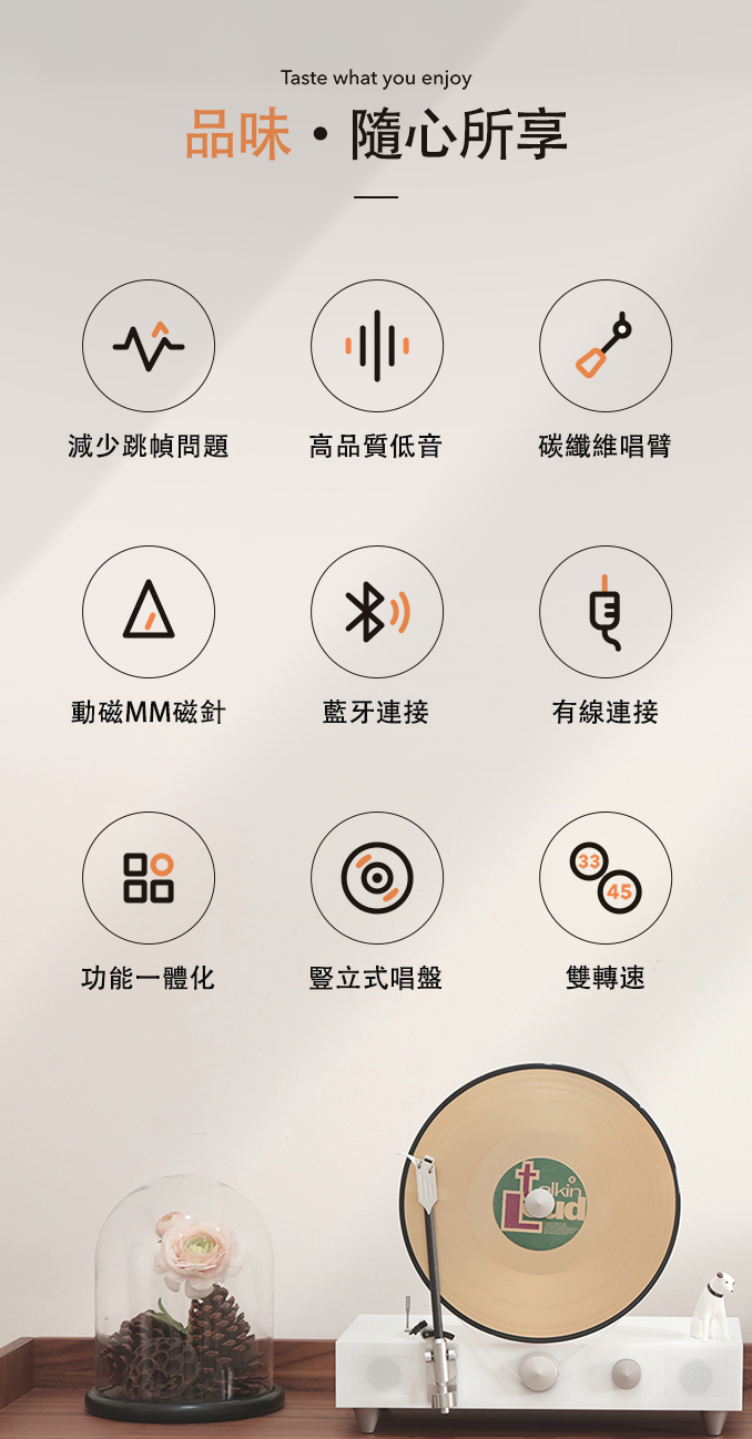• 內置:高保真音響級,RIAA均衡曲線、人工矽膠皮帶傳動系統 (33 1/3、45 RPM雙轉速),精密、鎖晶、電機控制電路、RCA線路含有高保真唱機前置放大器、內置高保真耳機放大器