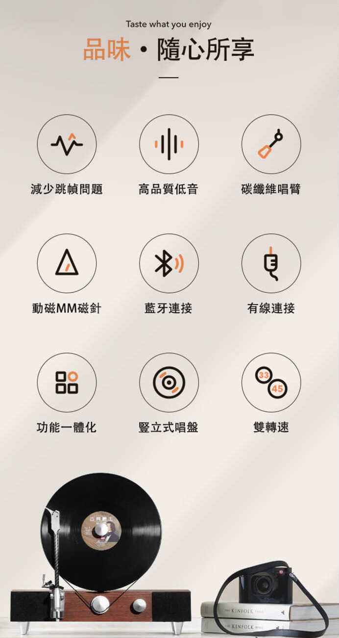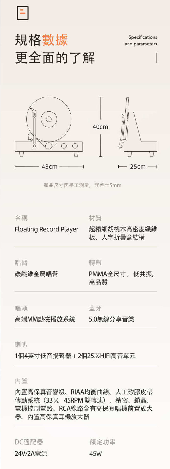 • 內置:高保真音響級,RIAA 均衡曲線、人工矽膠皮帶傳動系統 (33 1/3 RPM),精密、鎖晶、電機控制電路、RCA線路含有高保真唱機前置放大器、內置高保真耳機放大器