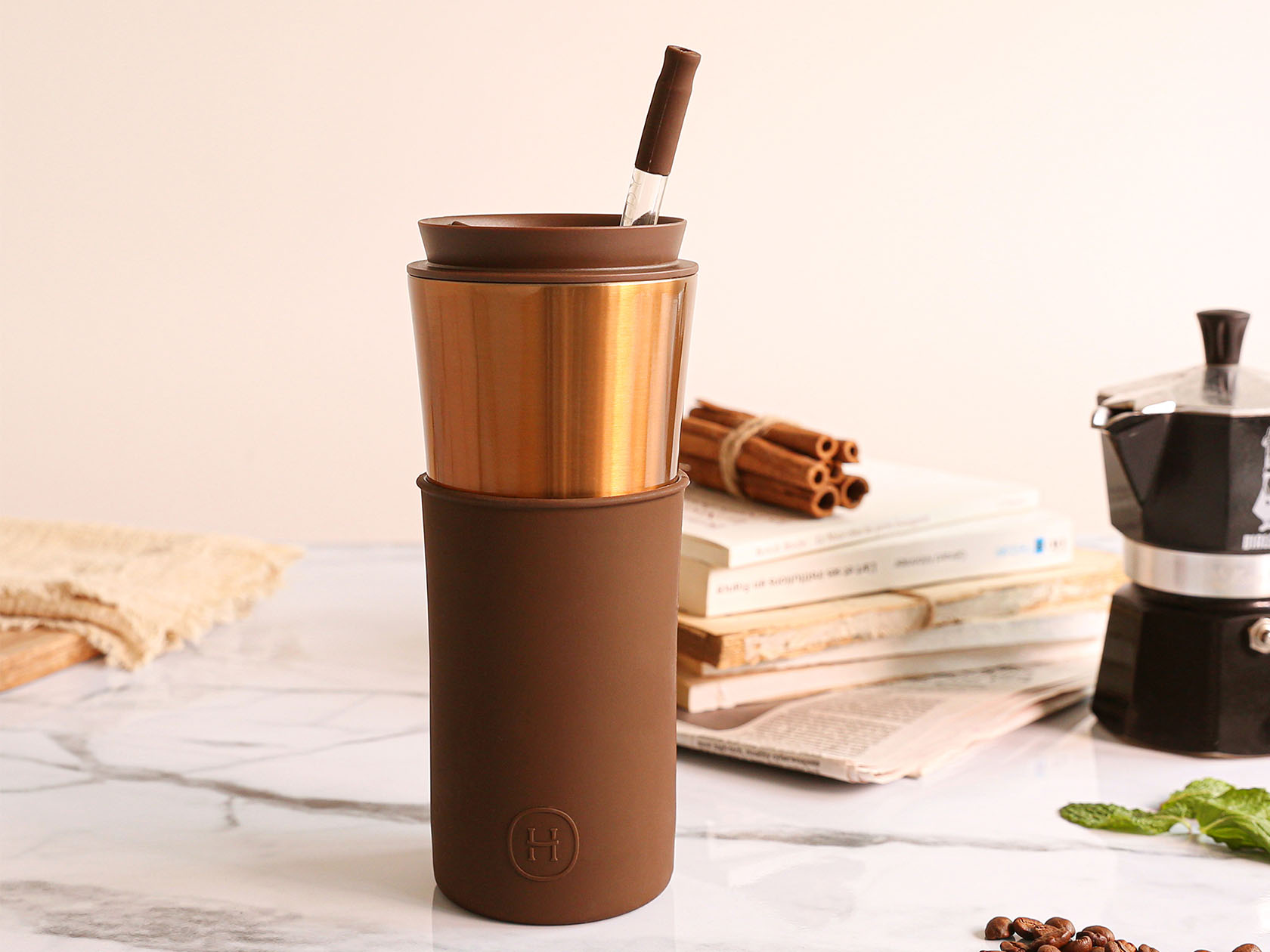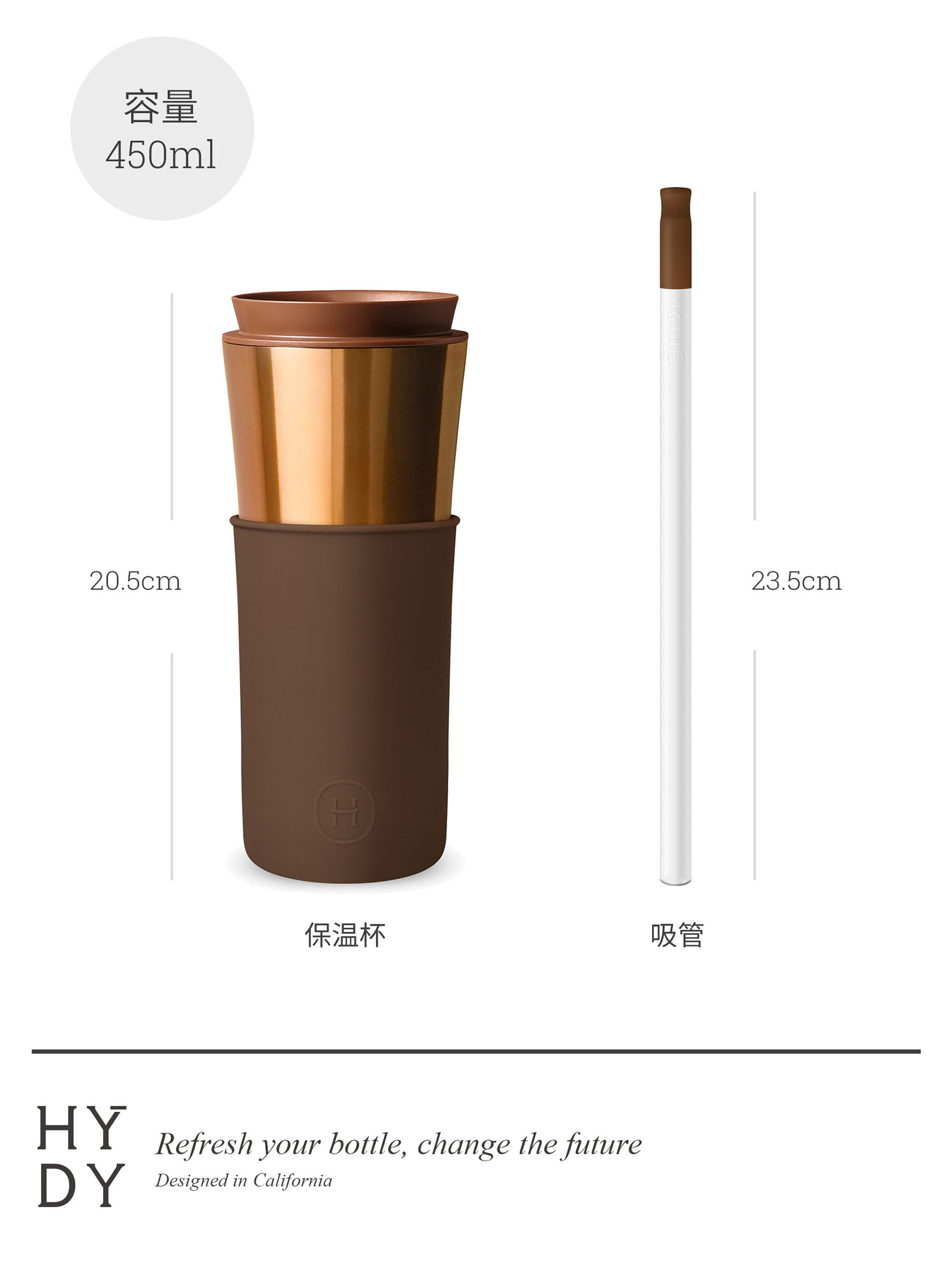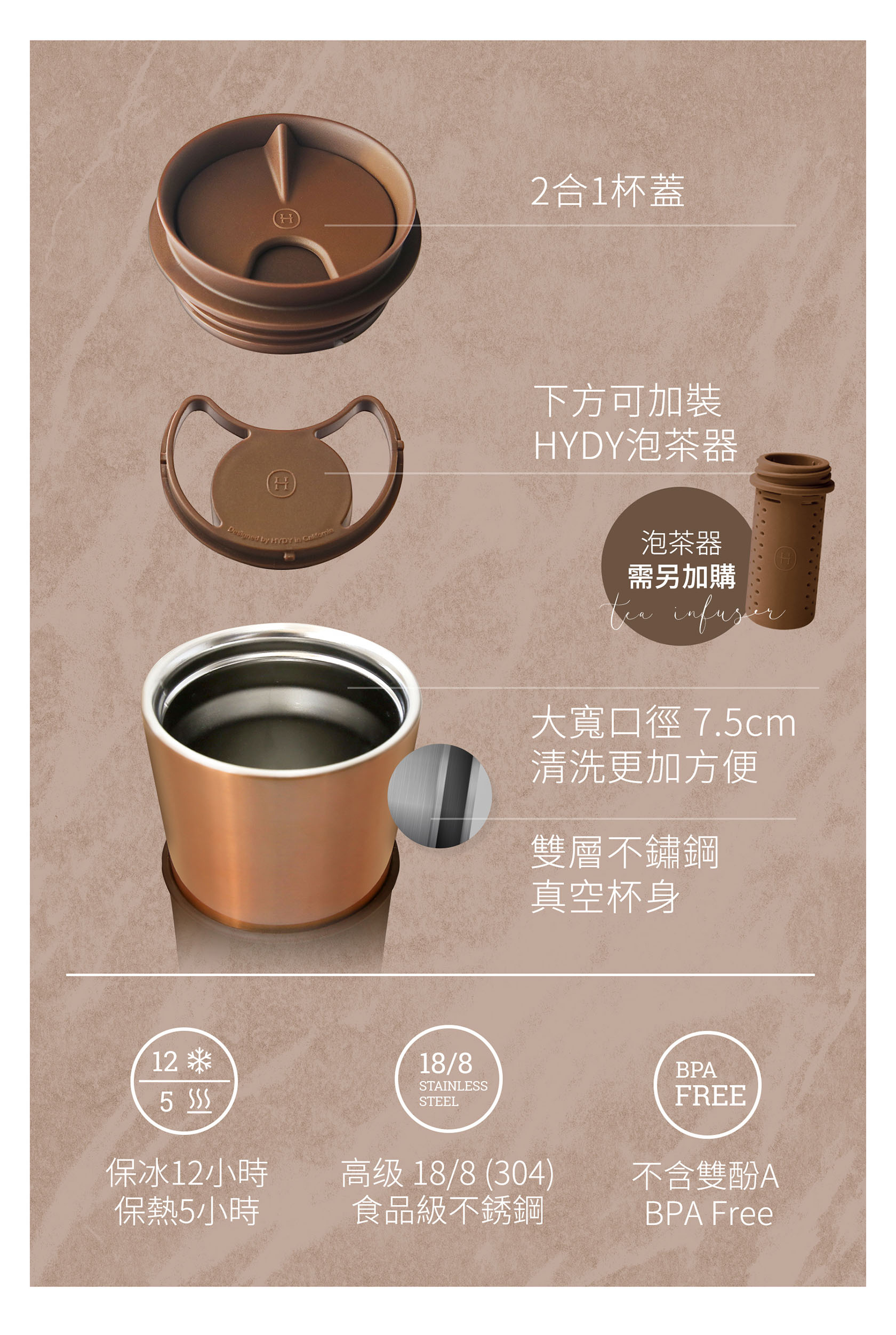 美國HYDY兩用隨行保溫杯 | 古銅金咖啡杯-摩卡(450ML)