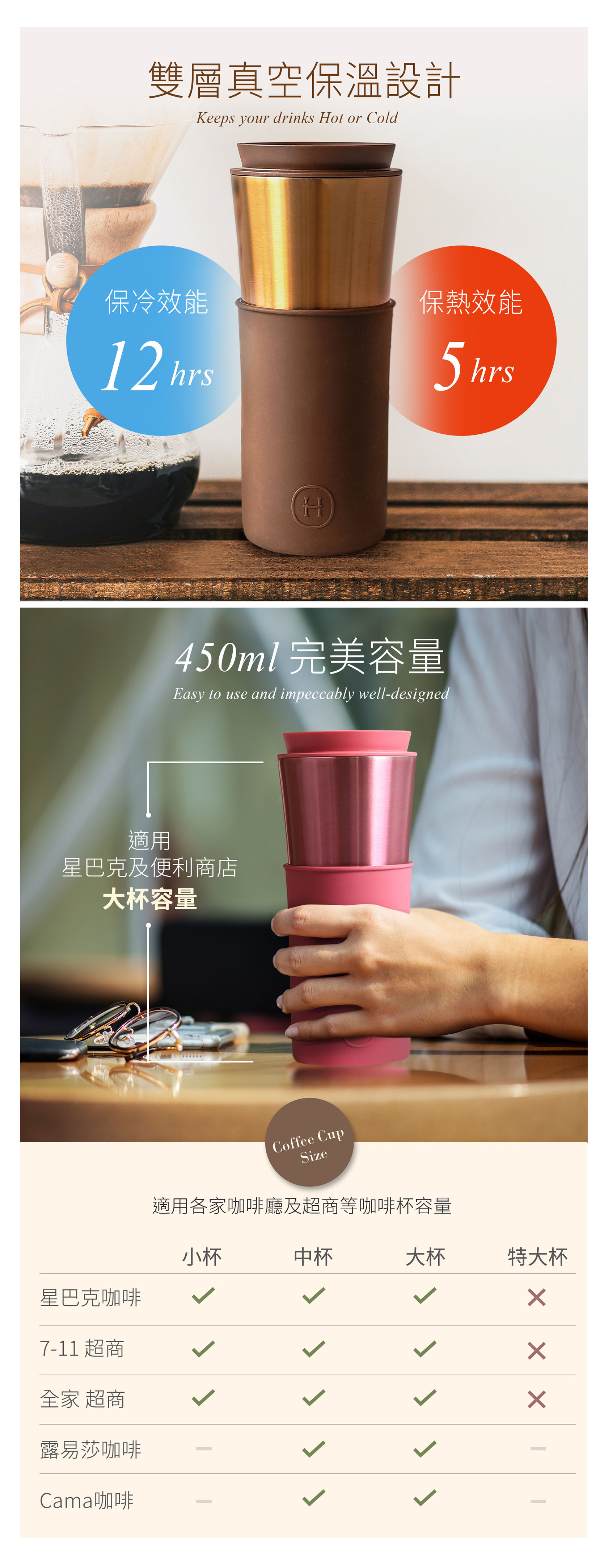 無論您在辦公室、健身房或是戶外運動,雙層真空不鏽鋼瓶身設計可保溫12小時、保冷24小時,任何情境都能享用想要的溫度。