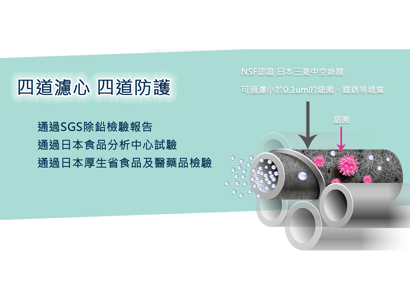 即開即飲,濾心採用日本及英國NSF認證材質,有效過濾有害物質增加微量礦物質之攝取、高效除氯、抑菌、保持純淨的水質