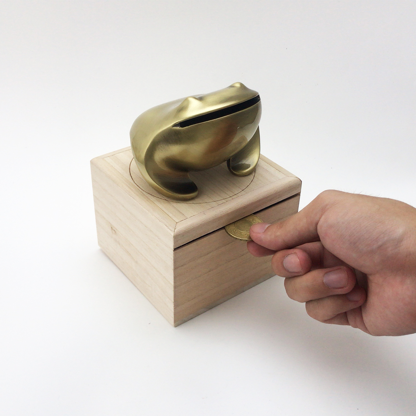 竹盒包裝,揪吉可以放在竹盒上面;竹盒前有一個長縫,也可以當作撲滿使用。