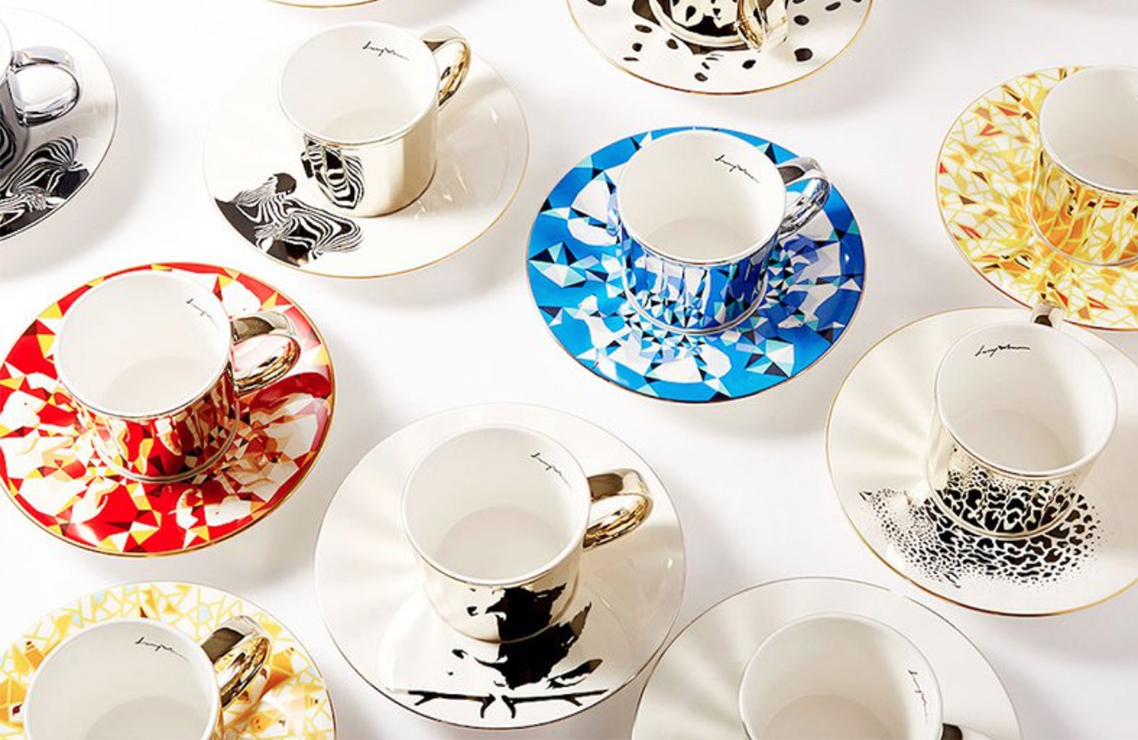 將杯子放在茶托上,杯子上的24面鏡子就會反射出來,茶托上隱藏在圖案中的圖像便會反覆出現商品規格。