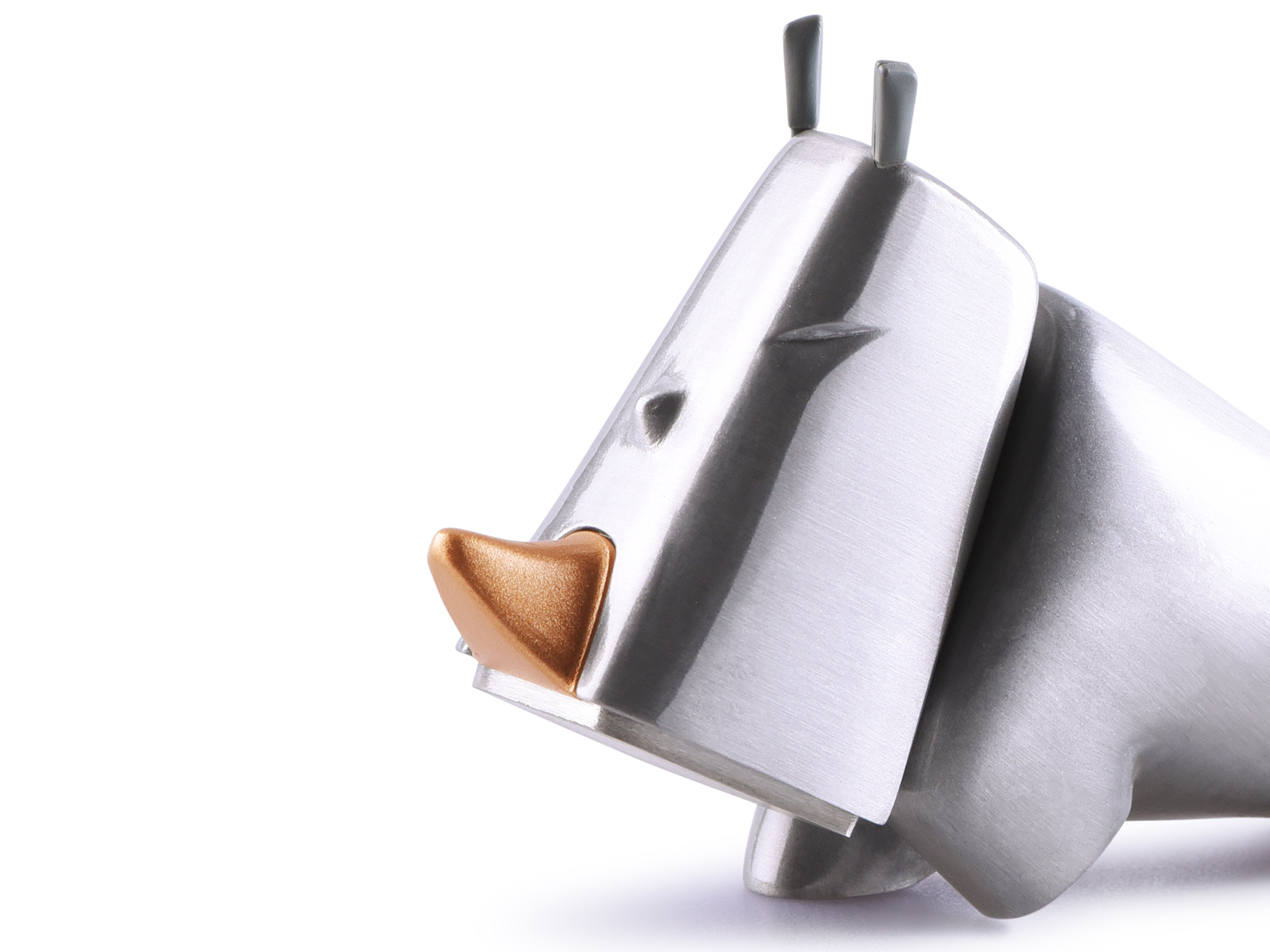 犀牛本體採用鋁合金,輕巧且不易生鏽,表面採用無毒材質噴漆,可安心讓家中成員使用;耳朵以橡膠為材質,與剛硬的材質區別,增添俏皮的趣味感。