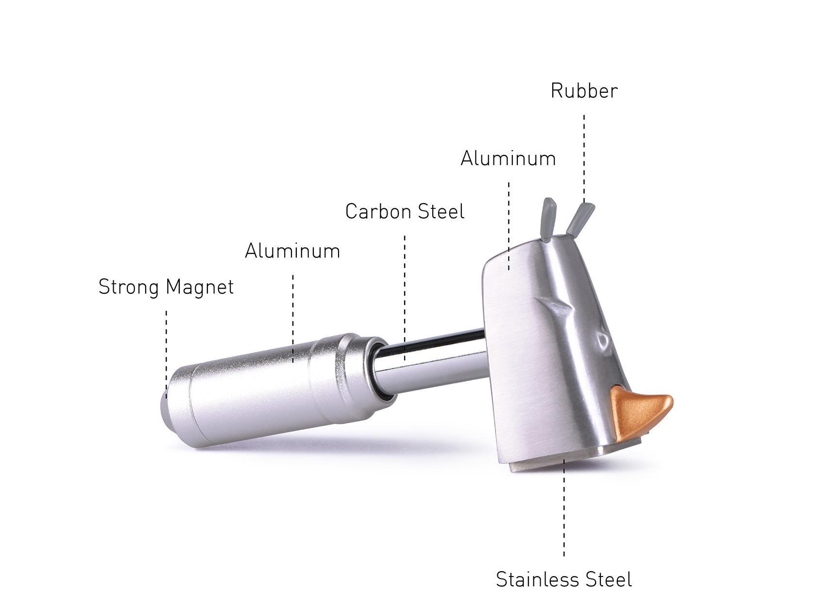 鋁合金握把及碳鋼伸縮桿材質,有效降低握持負擔及強化實用度;敲擊面選用不鏽鋼,髮絲面的紋路,提升產品的質感與設計感,讓Rhino不僅身為實用的小幫手,更晉升為家中有價值的收藏品。