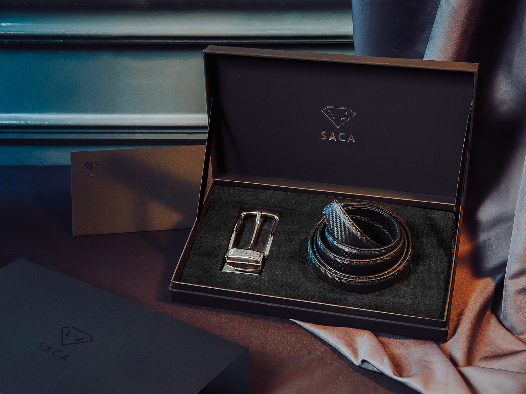 擷取自鑽石與眼鏡蛇兩項鮮明元素,眼鏡蛇擁有積極掠食的天性,是擅長控制與謀略的王者,而與碳纖維為同位素的鑽石,為logo畫龍點睛,不僅象徵SACA能跳脫暗黑,獨自閃耀,更強調產品的珍稀可貴。SACA以獨家碳纖維鍛造技術及X編織法,融合特殊無毒樹脂,為高品味標準的紳士打造非凡精品,屬於成功男性的黑鑽。