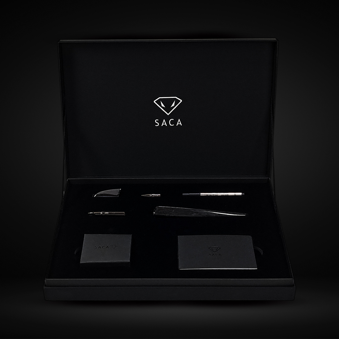 擷取自鑽石與眼鏡蛇兩項鮮明元素,眼鏡蛇擁有積極掠食的天性,是擅長控制與謀略的王者,而與碳纖維為同位素的鑽石,為logo畫龍點睛,不僅象徵SACA能跳脫暗黑,獨自閃耀,更強調產品的珍稀可貴,屬於成功男性的黑鑽。SACA以獨家碳纖維鍛造技術及X編織法,融合特殊無毒樹脂,為高品味標準的紳士打造非凡精品,屬於成功男性的黑鑽。