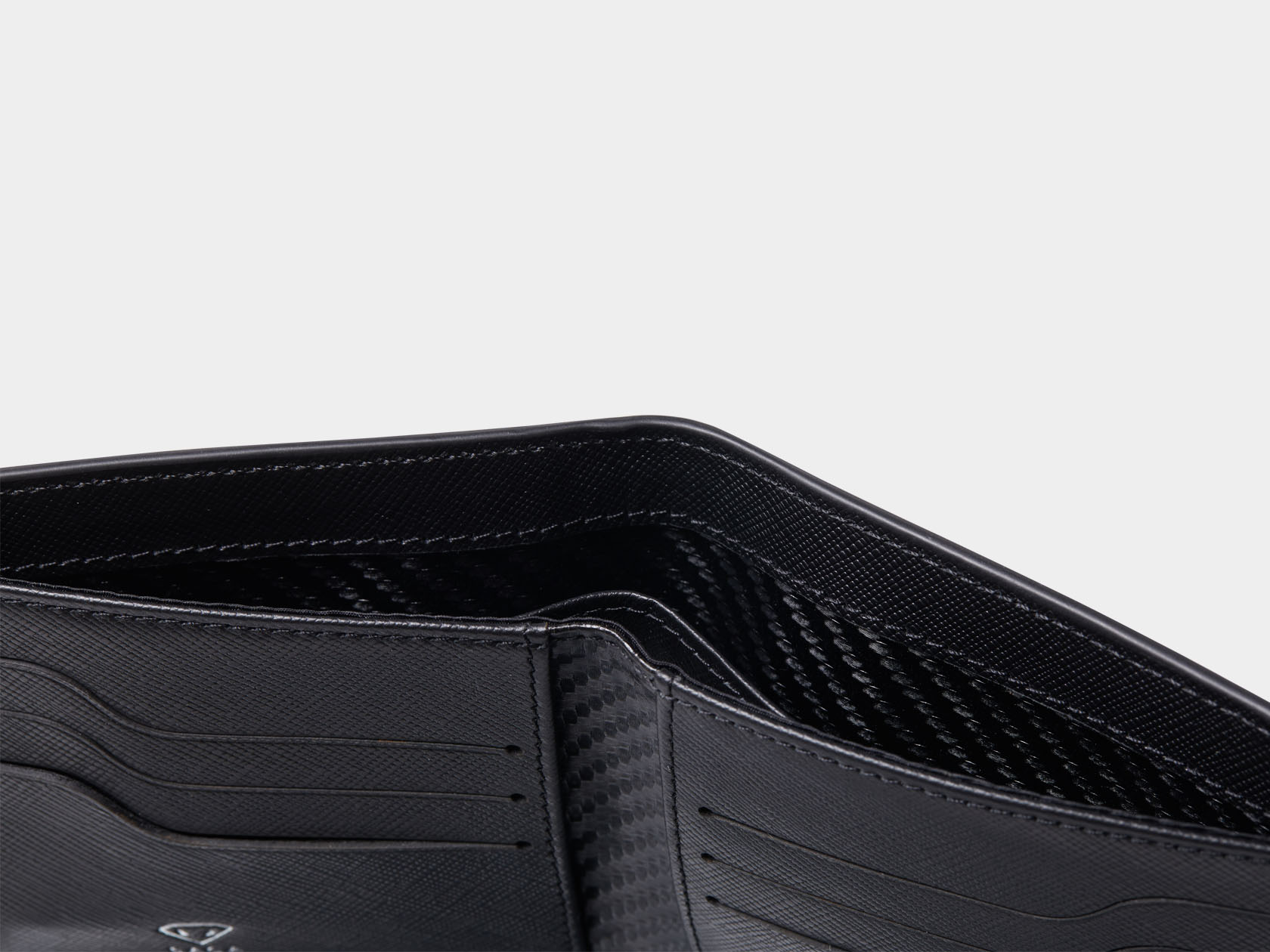 而內裡十字紋牛皮閃耀的光澤背後,暗藏獨家X技術編織而成的碳纖維布,擁有防盜機制阻擾RFID訊號。