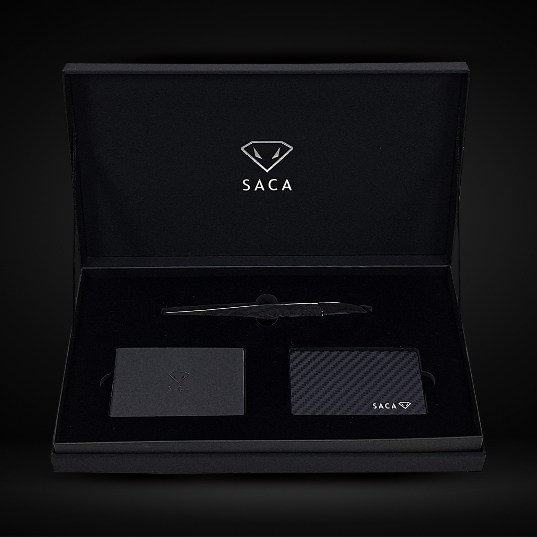 擷取自鑽石與眼鏡蛇兩項鮮明元素,眼鏡蛇擁有積極掠食的天性,是擅長控制與謀略的王者,而與碳纖維為同位素的鑽石,為logo畫龍點睛,不僅象徵SACA能跳脫暗黑,獨自閃耀,更強調產品的珍稀可貴。SACA以獨家碳纖維鍛造技術及X編織法,融合特殊無毒樹脂,為高品味標準的紳士打造非凡精品,屬於成功男性的黑鑽。