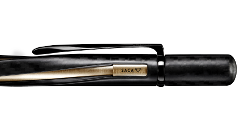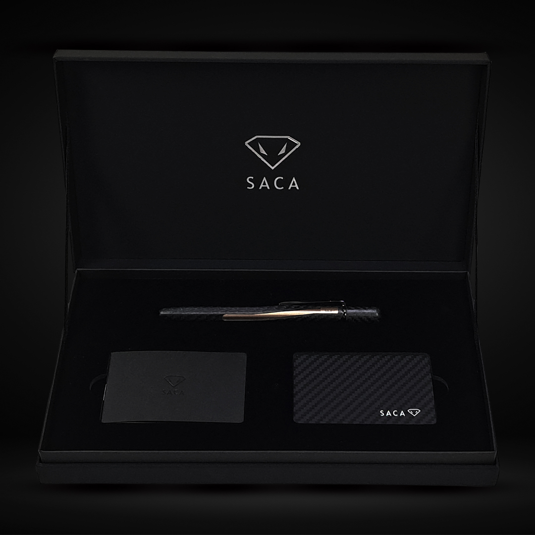 擷取自鑽石與眼鏡蛇兩項鮮明元素,眼鏡蛇擁有積極掠食的天性,是擅長控制與謀略的王者,而與碳纖維為同位素的鑽石,為logo畫龍點睛,不僅象徵SACA能跳脫暗黑,獨自閃耀,更強調產品的珍稀可貴。SACA以獨家碳纖維鍛造技術及X編織法,融合特殊無毒樹脂,為高品味標準的紳士打造非凡精品,屬於成功男性的黑鑽。