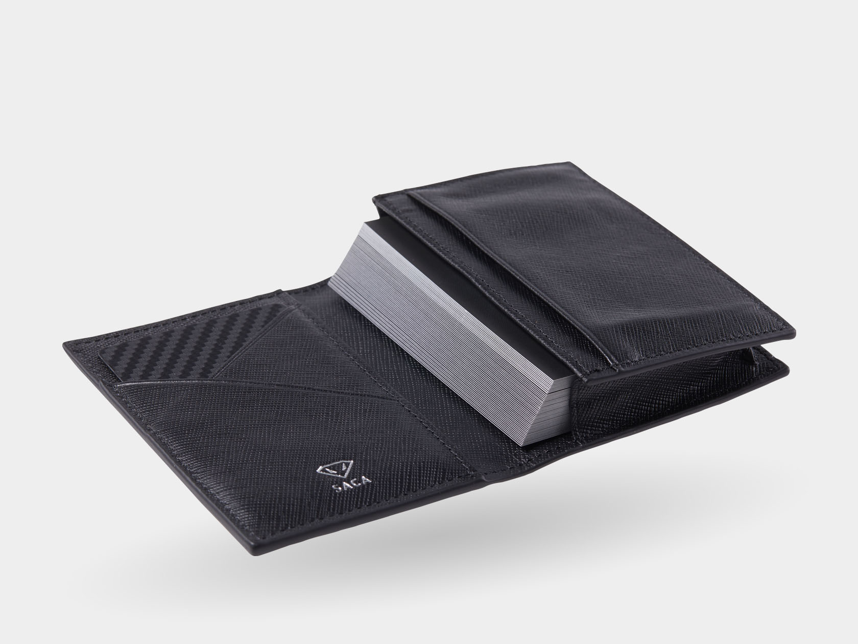 首發置入碳纖維布的名片夾,內裡暗藏獨家X技術編織而成的碳纖維布,擁有防盜機制阻擾RFID訊號