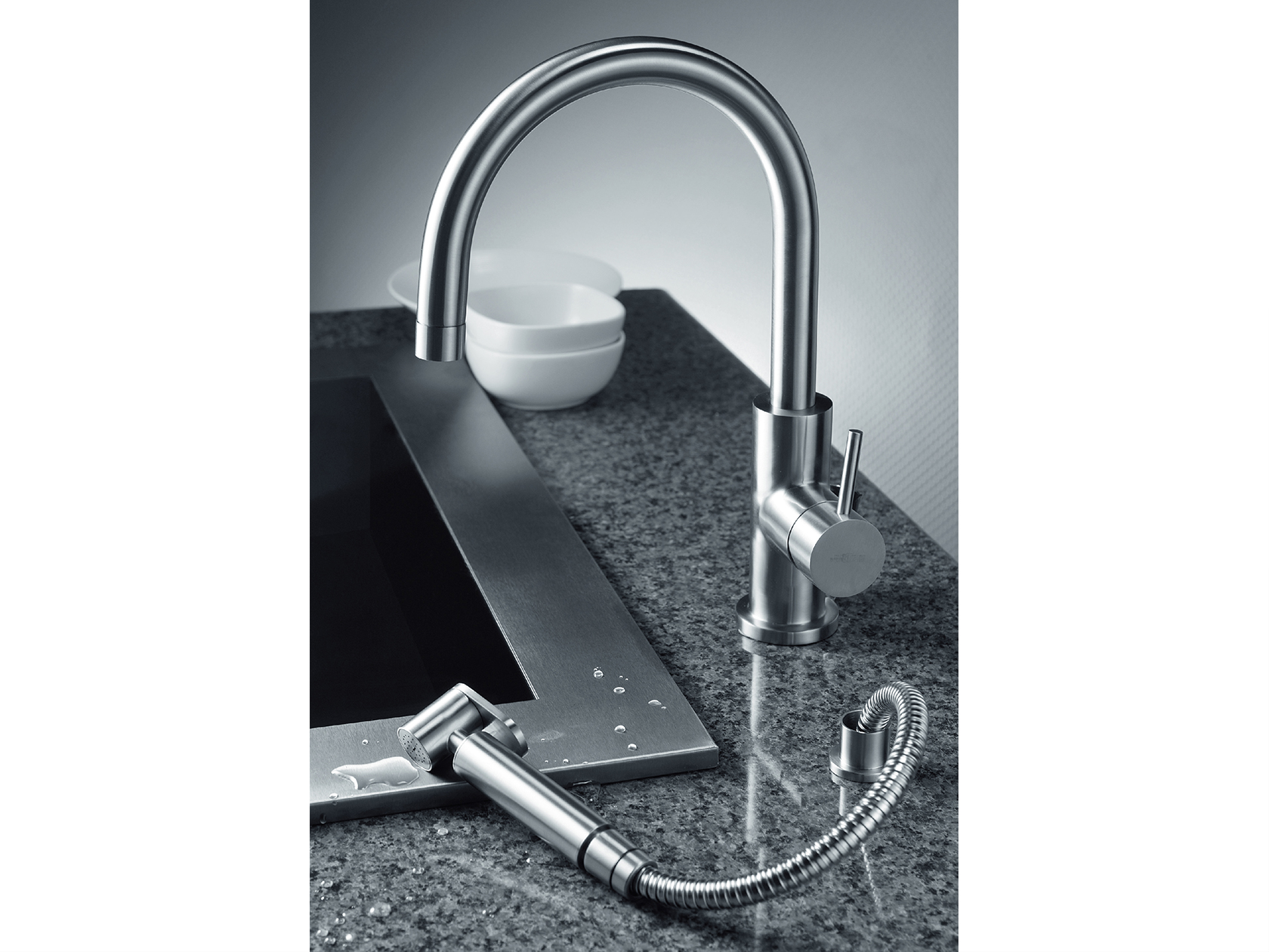 在功能上,可擺動的出水口方便使用,並利用虹吸的原理,只要按下洗滌器的開關板,水就會從水龍頭轉換到洗滌器,清洗流理台也非常便利;材質上,採用不銹鋼製作清理方便,耐用不易損壞。