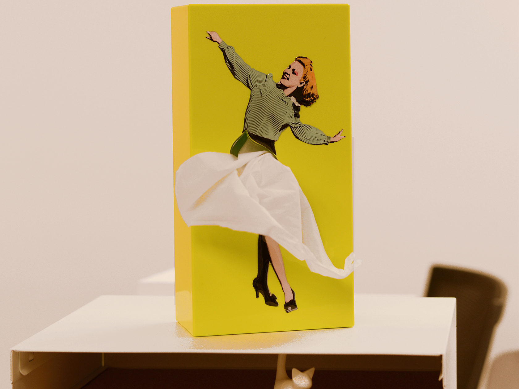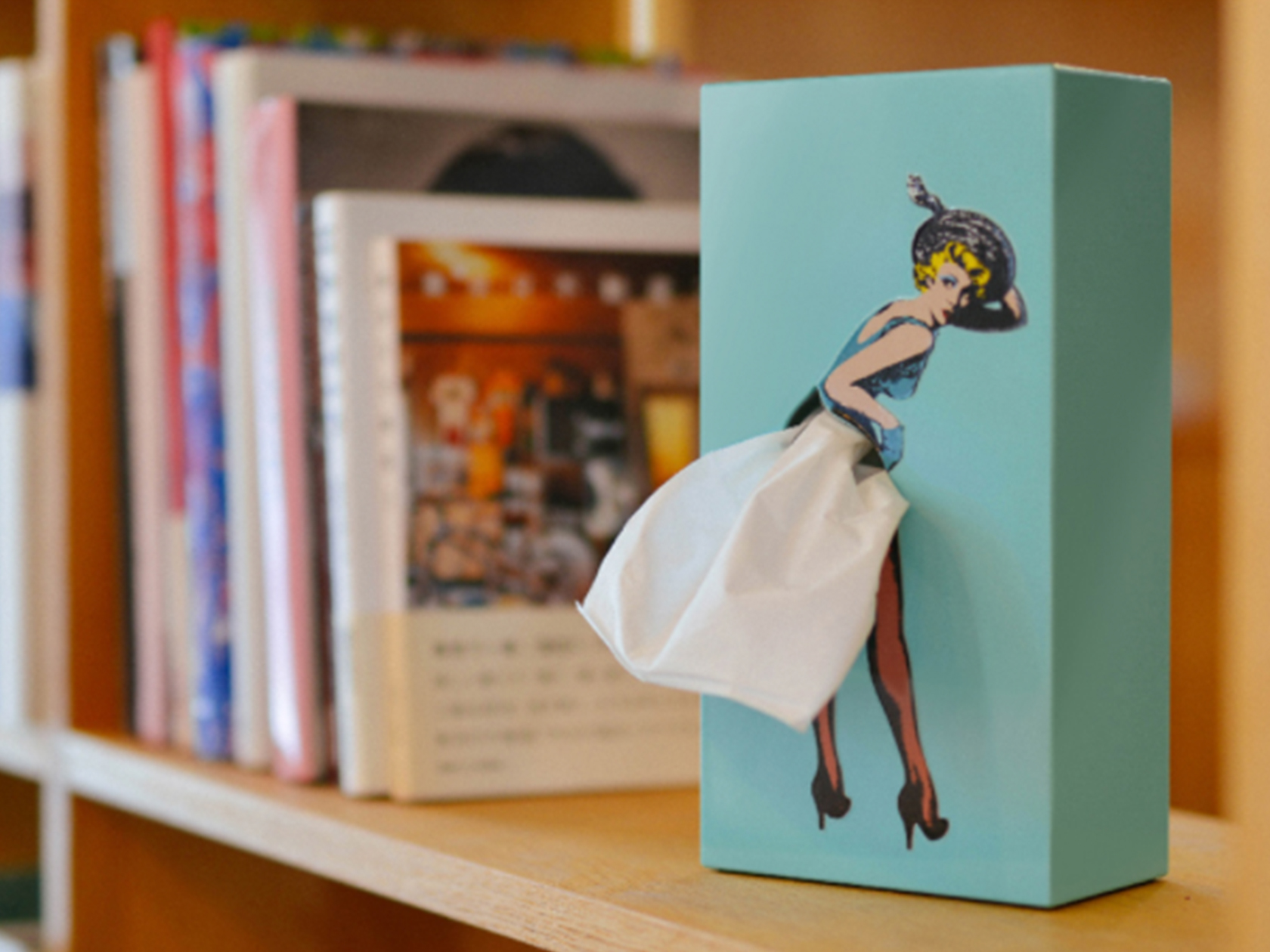 此款面紙盒的設計靈感來源於生活中的細節,由於裙子和紙巾具有相似性,抽紙的瞬間,設計師以海報女郎脫裙子為概念設計,巧妙的將兩個形象融合在一起,另外,可愛的顏色帶來特別的裝飾效果,又因為是豎立的設計,此款抽紙能抽到最後一張紙巾,每次從小口中抽出一張就會帶出另一張,乾淨衛生又有效率。