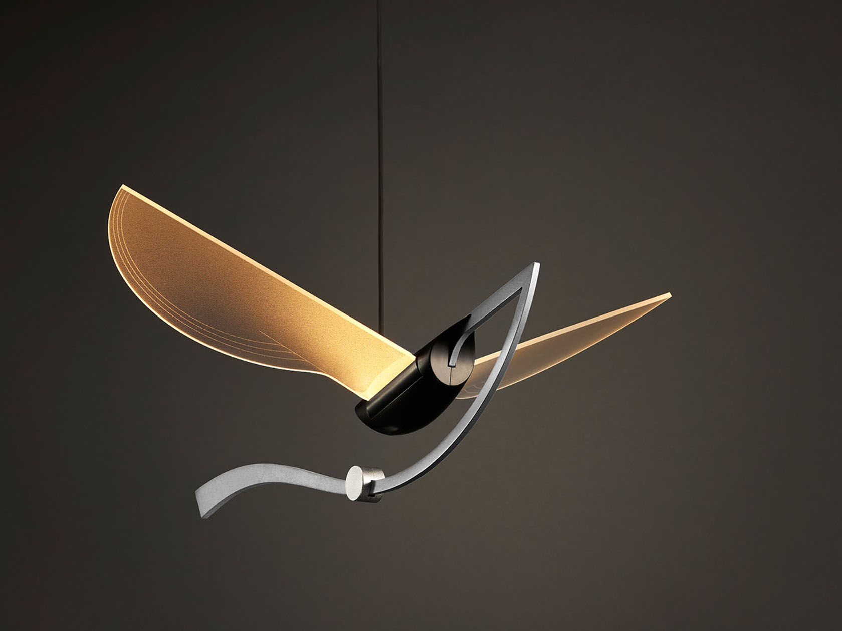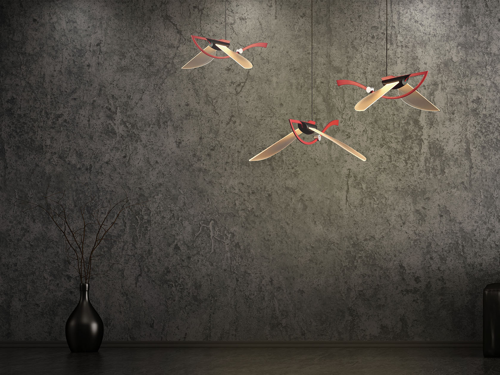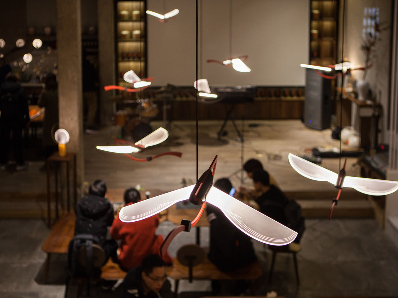 莊子【逍遙遊】裡一則《北冥之魚》的故事開啟了了我們對鯤的想像。鯤由上千萬顆微曲鏡組構成一隻大型的飛魚吊燈,魚身鳥翅突破傳統燈具該有的樣貌,在工藝與工業間自在優游。擺動著發光的翅膀,時而向天際翱翔,時而向下俯衝。大海關不住這屬於天空的魚,屋瓦也困不住這悠游自在的心。